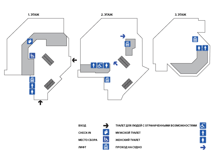 Для индивидуальных пассажиров, групп и пассажиров на транспортных средствах предусмотрены разные пункты регистрации. Для пассажиров кают класса Suite предусмотрена общая регистрация (кроме пассажиров на автомобилях).